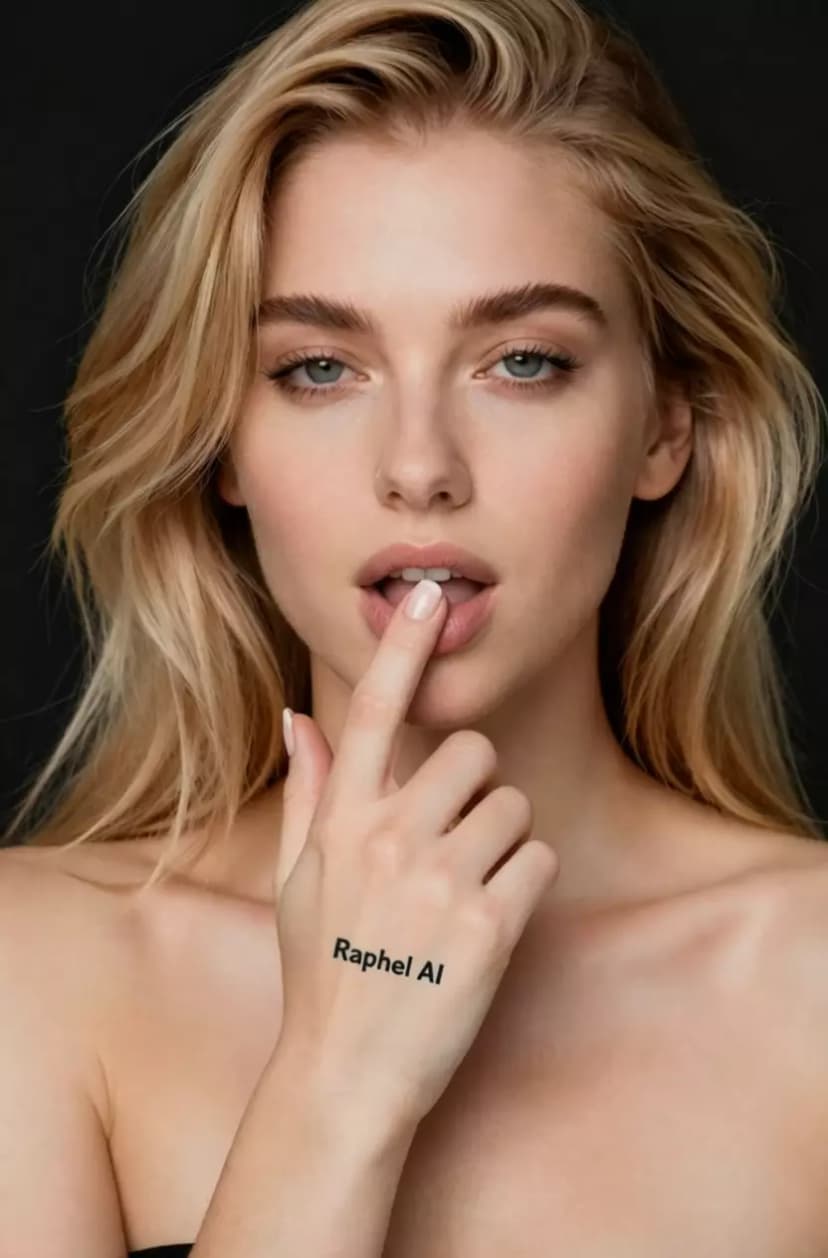 Blonde, beautiful woman wearing a cropped satin top, seen from an elevated angle. Soft light highlights her curves and elegant posture. A stylish 'Raphael AI' tattoo is visible on her arm.