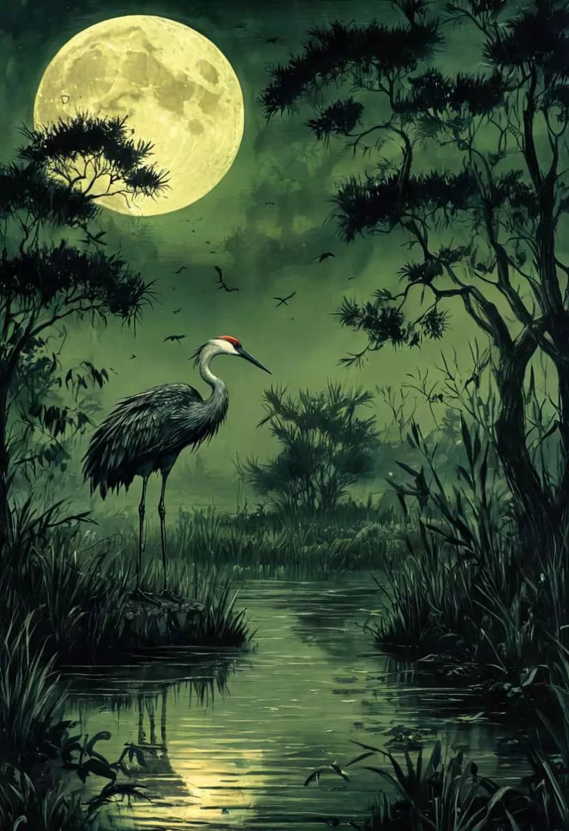 high quality illustration with an ink painting / oriental atmosphere. night scene in a marsh or wetland, dominated by a huge full moon in the upper left, glowing pale yellow and tinting the sky with green mist. calm water in the center reflects the moonlight. tall grasses, reeds and twisted trees frame both sides. in the foreground by the water stands a tall crane or heron, white and gray feathers, quietly gazing over the water.