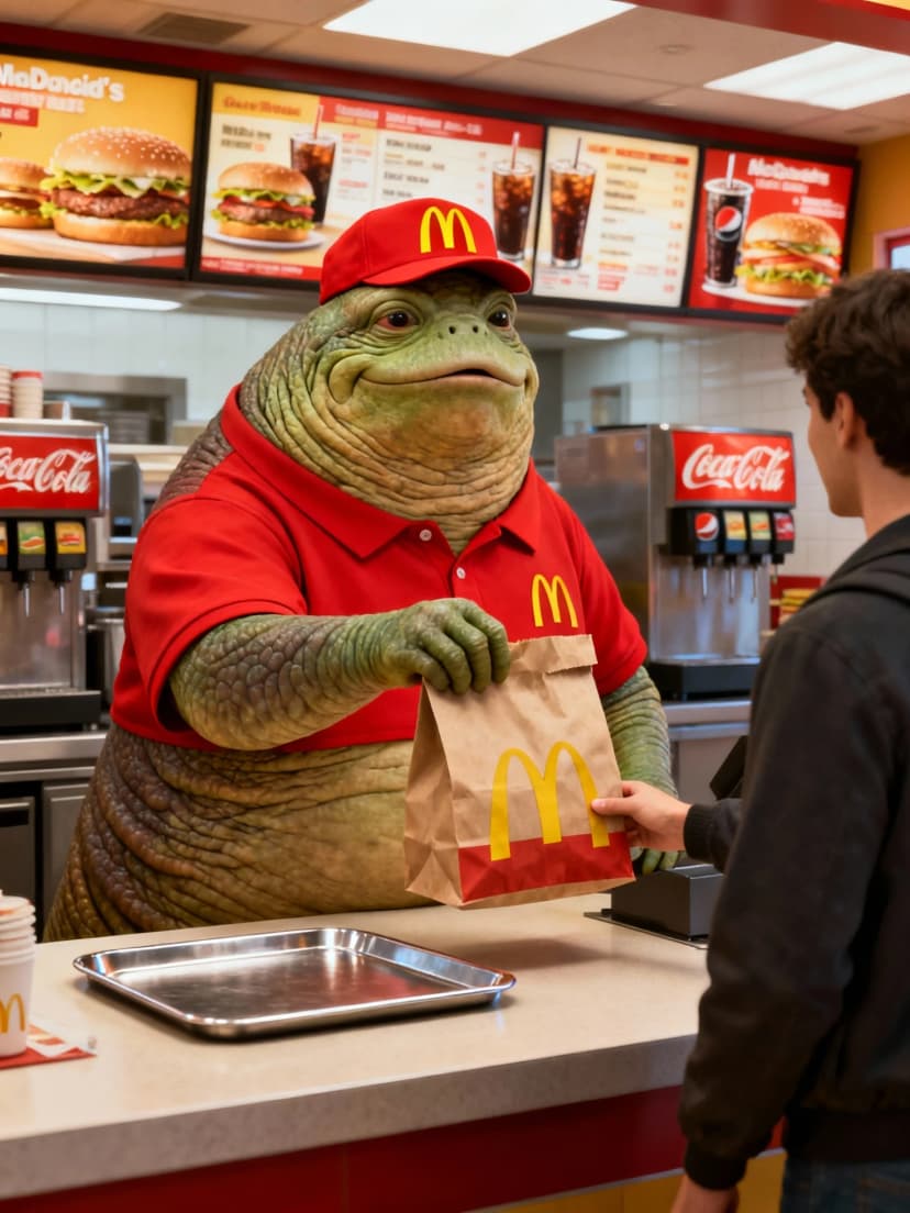 ultra realistic 3D render, humorous scene in a McDonald's style fast food restaurant, warm indoor lighting. a large slug-like alien, Jabba the Hutt type, with wrinkled greenish-brown skin, wearing a red McDonald's employee polo shirt and cap with the yellow M logo, standing behind the counter, handing a brown paper bag with the golden arches to a customer.