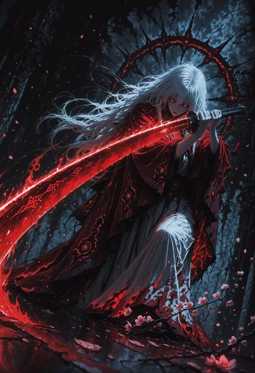 dark fantasy, high quality ultra detailed anime illustration, 1girl with very long flowing silver-white hair blowing in the wind, glowing red eyes, cold and fierce expression. she grips a katana with both hands, the blade emitting intense blood-red light and a long sweeping energy arc, like burning blood and lightning. she wears a deep red and black kimono-style cloak covered in eerie circular eye-like patterns and red crack veins, with a tattered white dress underneath. background is a shadowy forest / gothic ruins, a huge spiked blood-red halo or magic circle behind her against a stormy dark blue night sky. ground is dark, wet and cracked, scattered with pink cherry blossom petals and branches, petals drifting in the air. strong contrast lighting, cool blue ambient light mixed with vivid red sword glow, lots of sparks and particles, dramatic, ominous, epic atmosphere, no text, no watermark, anime style.