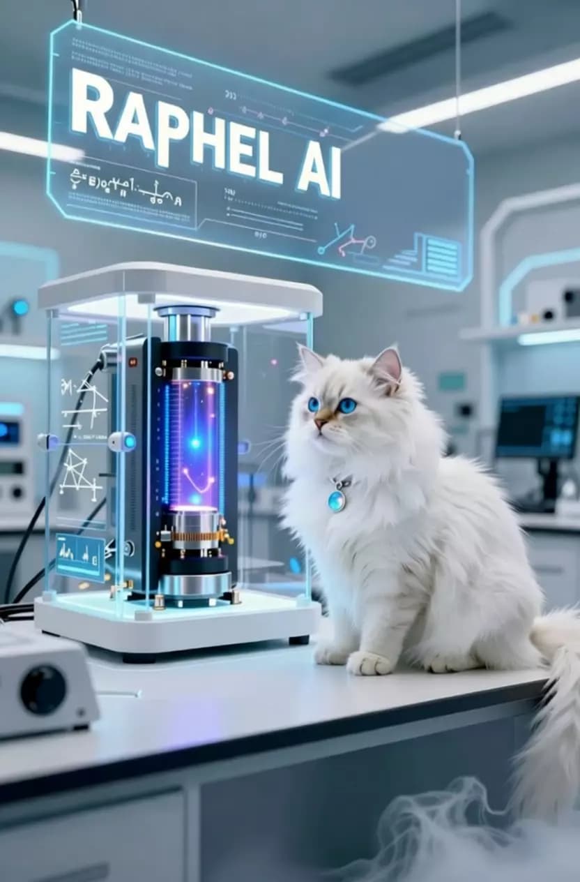 Cutting-edge quantum computing research laboratory with pristine white surfaces and premium materials. Centerpiece quantum processor visible through transparent protective chamber with blue-violet plasma glow. Large holographic display above showing "Raphael AI" in elegant platinum-white luminous letters with precision-engineered typography and subtle prismatic refraction effects. Majestic long-haired white Persian cat with brilliant blue eyes sitting gracefully on pristine white laboratory desk beside holographic controls, perfectly groomed fluffy coat glowing softly in ambient lighting. Cat observing quantum processor with intelligent contemplative gaze, one paw delicately positioned near transparent control panel.