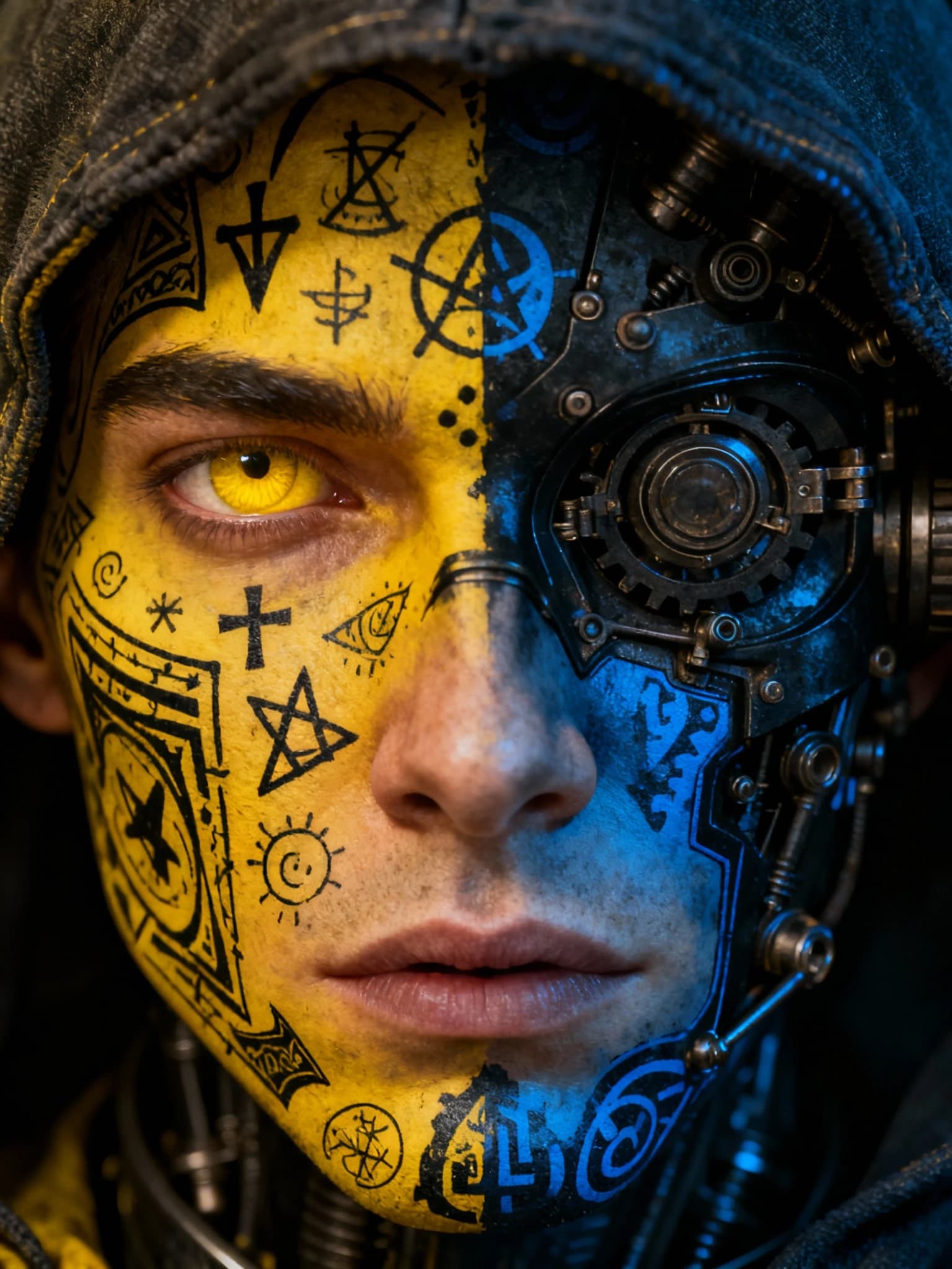 A close-up of a face adorned with intricate black and blue patterns. The left side of the face is predominantly yellow, with symbols and doodles, while the right side is dark, featuring mechanical elements. The eye on the left is a striking shade of yellow, contrasting sharply with the surrounding patterns. The face is partially covered by a hooded garment, cinematic_1940s cinematic_octane.