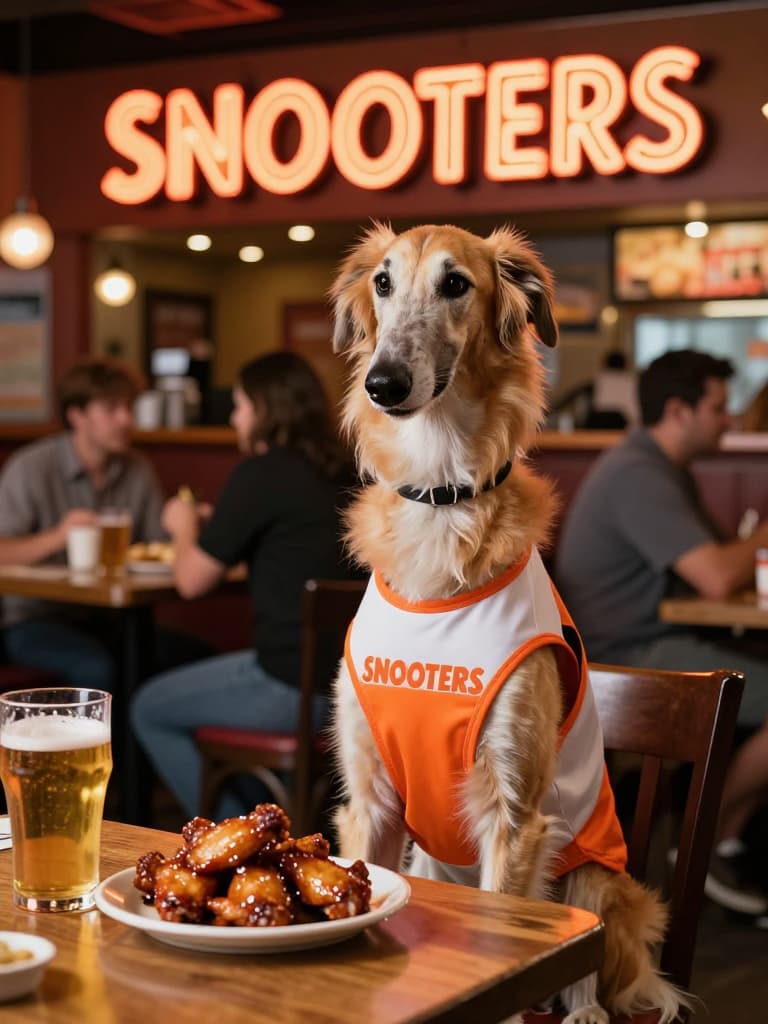 high quality humorous photo in a warm-lit American sports bar / restaurant. in the background a big orange neon sign reads "SNOOTERS", with busy diners and wooden tables softly blurred by shallow depth of field. in the foreground a Borzoi dog (long narrow face, tall and fluffy) sits upright on a chair like a waiter, wearing an orange and white tank top and shorts with the word "SNOOTERS" printed on the shirt.