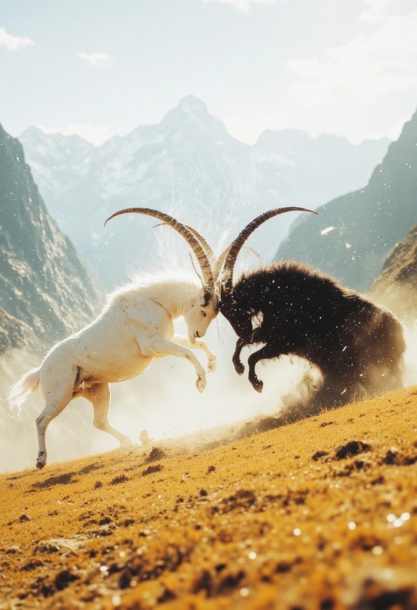 A hyper-detailed action scene: a windswept mountain slope, two mountain goats, one pure white and the other deep black, captured at the exact moment of impact as their horns collide mid-charge. The air trembles with motion; dust, grass, and sunlight burst outward in radiant fragments from the collision point.